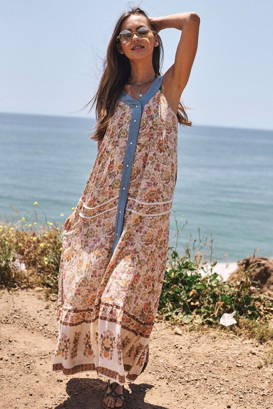 Floral Border Printed V-Neck Sleeveless Maxi Dress