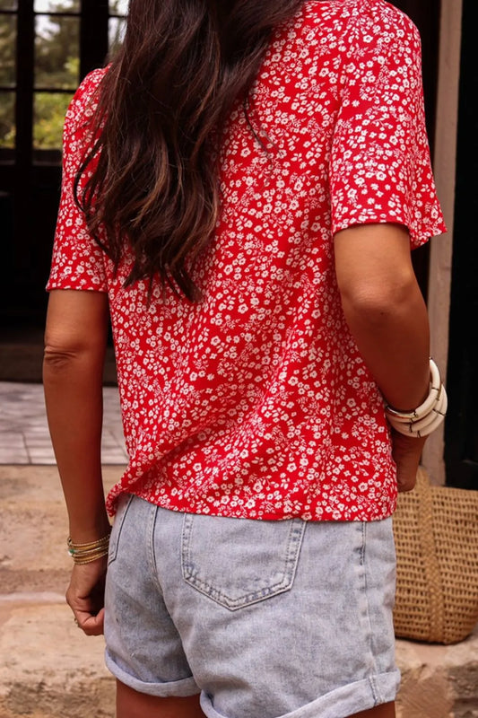 Boho Floral Printed Half Sleeve Knotted V Neck Blouse