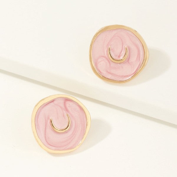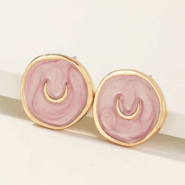 A must-have: handmade oil dripping, round-shaped earrings with a modern chic flair. This pair features a crescent moon symbol, believed to help relieve tension, avoid confusion and bring better understanding in couple's relationships. Matching necklace and ring sold separately.