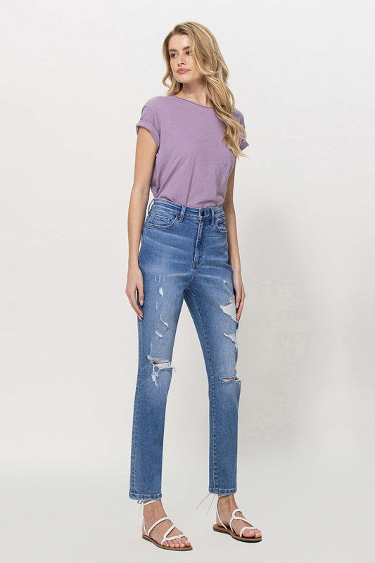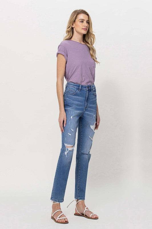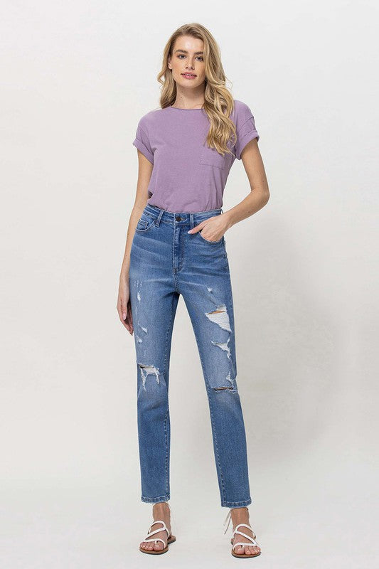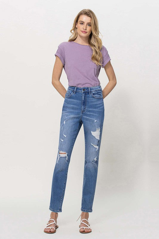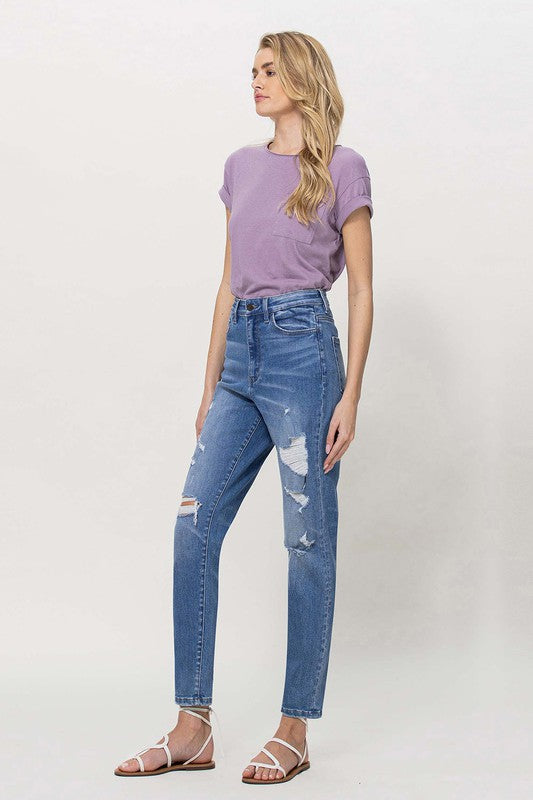 Discover the ideal fusion of comfort and vintage-inspired flair with the "Stretch Mom Distress Jeans." These jeans combine a stretchy fabric for ease of movement with the classic mom jean silhouette, offering a comfortable yet stylish fit. The distressed detailing adds an edgy touch, making these jeans a versatile option to effortlessly elevate your casual ensembles with a touch of rugged charm.