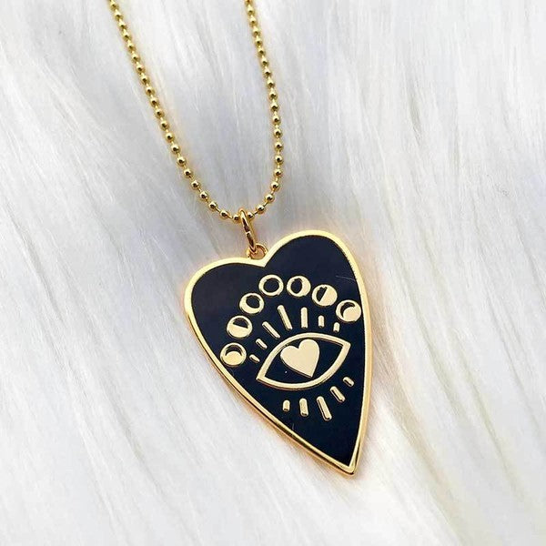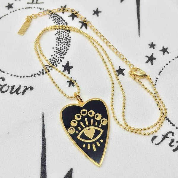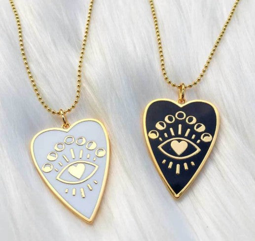 Black or white enamel heart pendant on a dotted cord gold plated necklace.