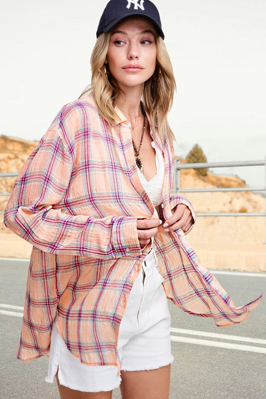 A bold and stylish button-down shirt that effortlessly blends fashion and comfort. This shirt features a striking plaid print and is designed with a relaxed fit, making it a versatile addition to your wardrobe.